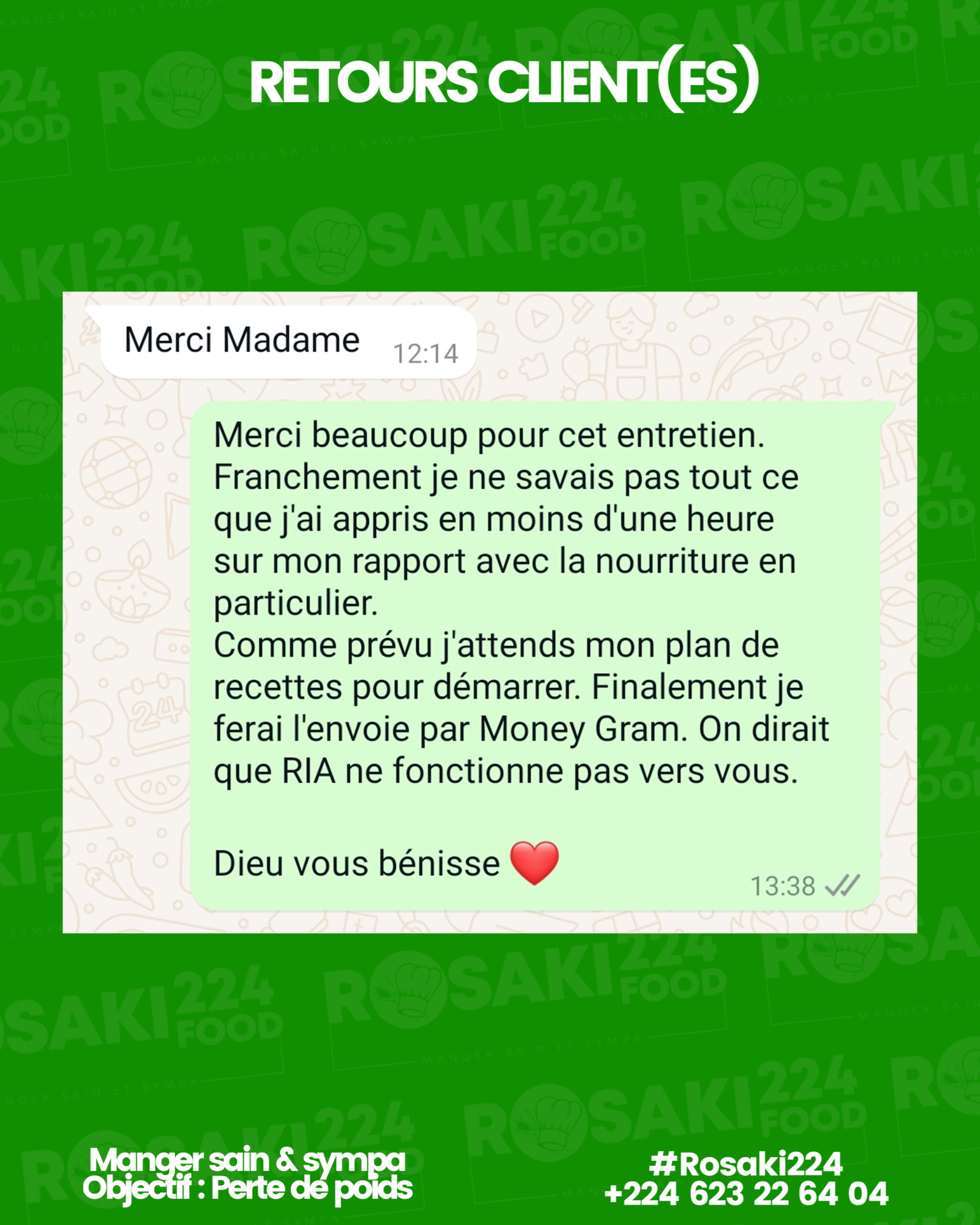 Je vous recommande par mesure de sécurité, de nous écrire immédiatement après le versement entre 8h TU et 18h TU au numéro suivant: +224 623 22 64 04 via WhatsApp, afin de vous assurer d’obtenir votre reçu de paiement et votre rendez-vous d'appel.